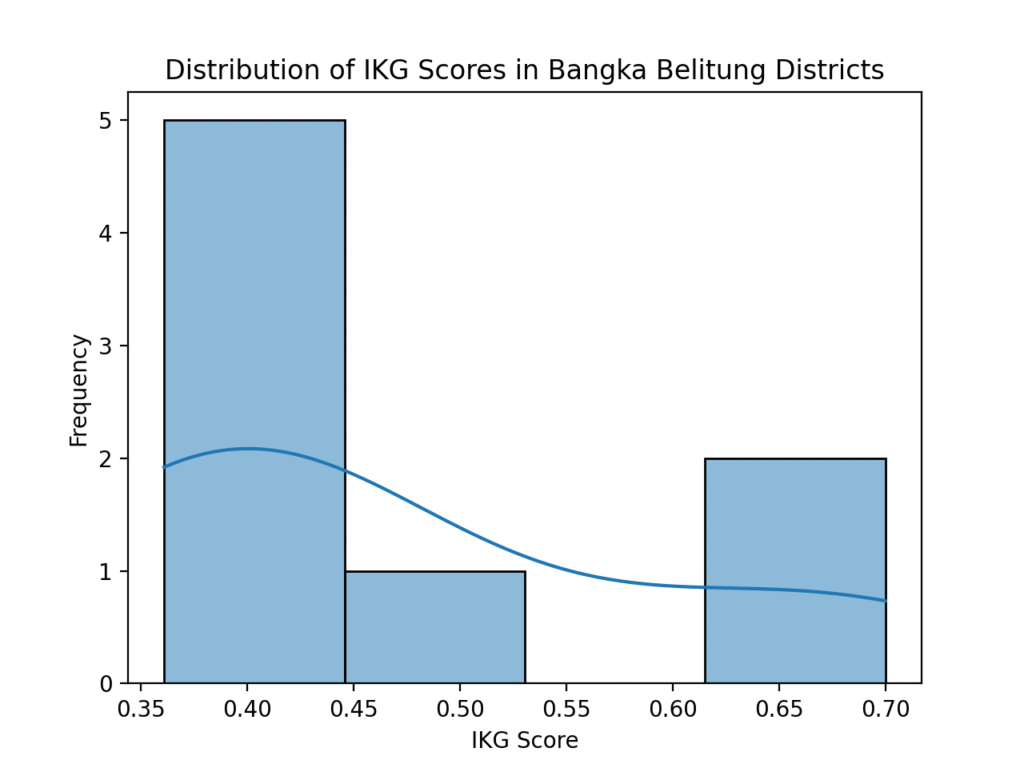 Histogram distribusi IKG memperlihatkan mayoritas kabupaten/kota di Bangka Belitung mengendap pada skor antara 0,35 hingga 0,45. Ini artinya, sebagian besar wilayah menunjukkan tingkat ketimpangan gender yang masih moderat menuju tinggi.