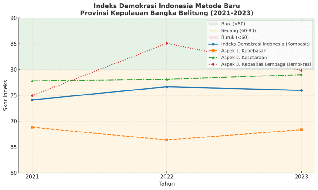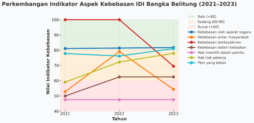 Data Indeks Demokrasi Indonesia (IDI) Provinsi Kepulauan Bangka Belitung 2021–2023 memberi sinyal bahwa kebebasan kita masih rapuh. Dari tujuh indikator, hanya sebagian yang konsisten berada di kategori “baik” (nilai >80). Misalnya, kebebasan berkeyakinan yang sempurna nilainya (100) pada 2021–2022, serta kebebasan dari tekanan aparat negara yang stabil di angka 81-an. Namun, kebebasan antar masyarakat justru memprihatinkan, hanya naik tipis dari 52,83 (2021) ke 54,38 (2023) dan tetap berada di kategori buruk. Padahal, demokrasi seharusnya memastikan semua warga negara diperlakukan setara dan bebas, memberi akses politik tanpa diskriminasi, dan melindungi hak individu tanpa memandang latar belakang (Altman & Wellman, 2008; Silander, 2020).