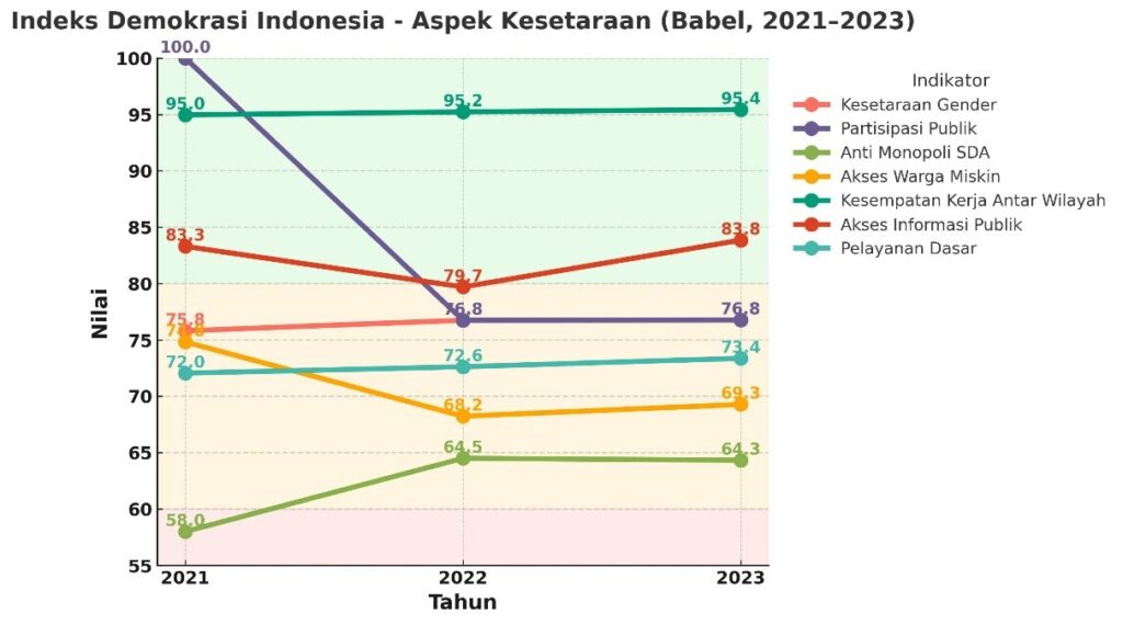 Provinsi Kepulauan Bangka Belitung mencatat tren positif pada aspek kesetaraan Indeks Demokrasi Indonesia (IDI) periode 2021–2023. Nilainya meningkat dari 77,80 di 2021 menjadi 78,98 di 2023. Meski terlihat membaik, angka ini masih berada di kategori “sedang”—pertanda bahwa kesetaraan yang dirasakan warga belum sepenuhnya nyata. Salah satu sinyal merah terlihat pada indikator anti monopoli sumber daya ekonomi yang hanya berada di kisaran 58–64, masuk kategori “buruk”. Ini menunjukkan bahwa akses ekonomi masih terkonsentrasi di tangan segelintir pihak, meninggalkan banyak warga di pinggir arena.