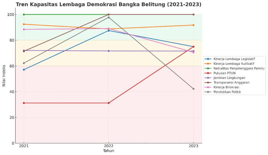 Beberapa indikator penting lain pun belum konsisten membaik. Kinerja Lembaga Legislatif memang sempat melonjak di 2022, tapi langsung melemah kembali pada 2023. Putusan PTUN terkait kebijakan pemerintah meningkat signifikan pada 2023, namun nilainya masih di bawah 80. Artinya, transparansi dan akuntabilitas kebijakan publik di Bangka Belitung belum menjadi budaya yang mengakar. Jika kondisi ini terus dibiarkan, demokrasi lokal berisiko mandek atau bahkan mundur.